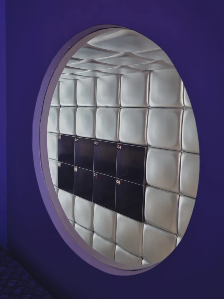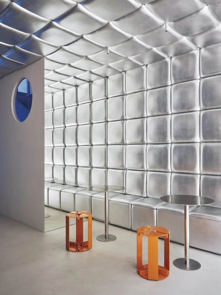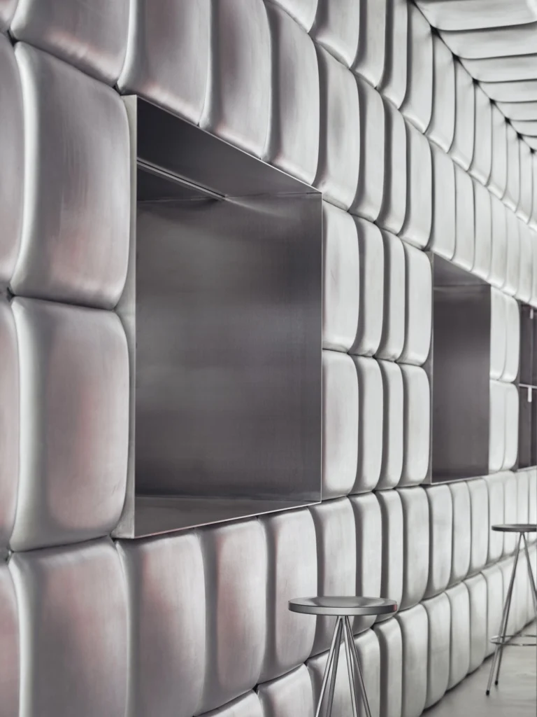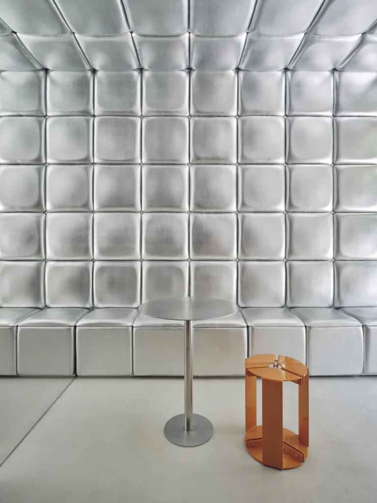Here Ohoskin® plays a starring role: its Silver version has been selected not just for its stunning metallic satin finish that reflects light and elevates the space but for its deeper story: crafted from Sicilian agro-by-products (orange and cactus pear) and combined with bio-based or recycled polymers.
